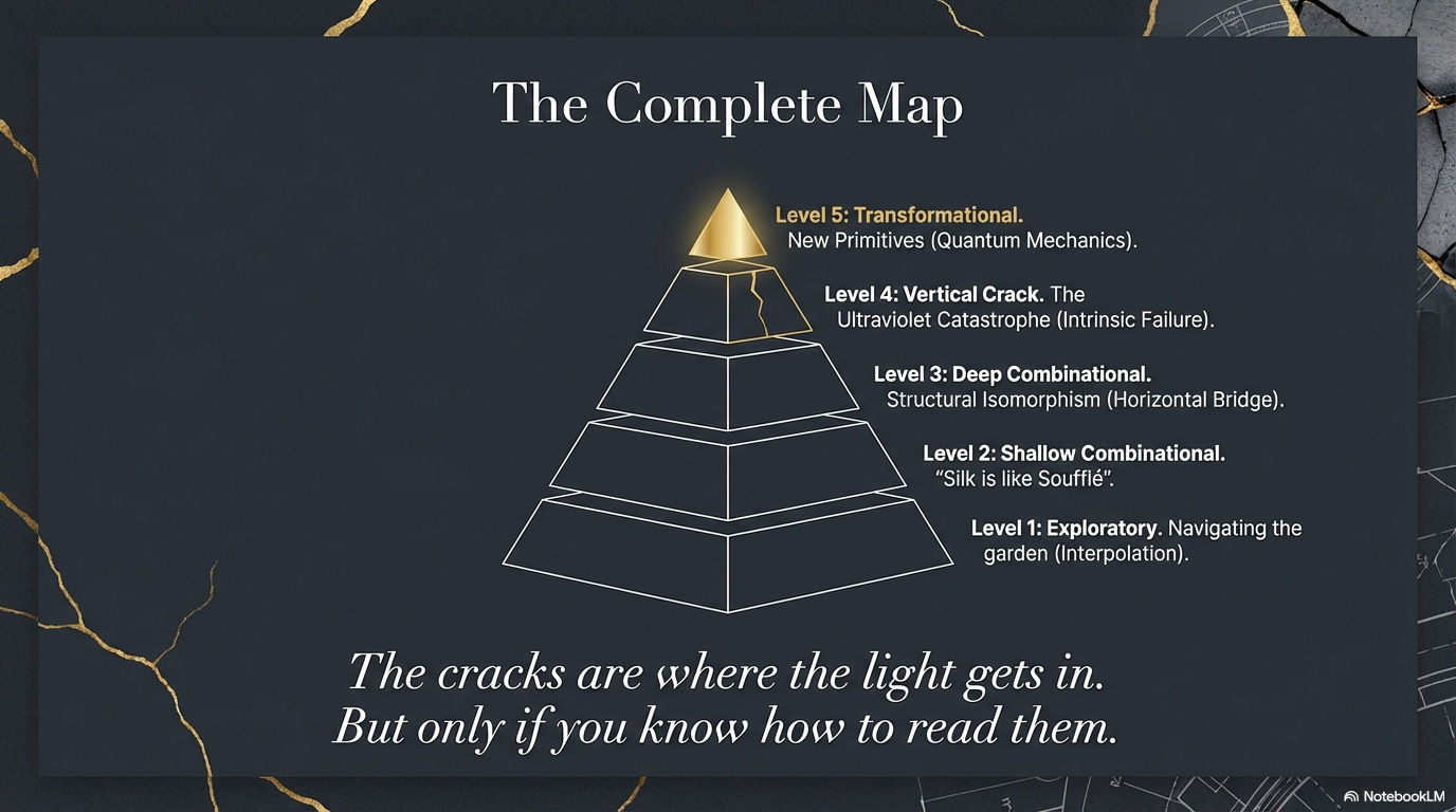 The pattern is consistent: deep combinational creativity builds the structural bridges across which transformational creativity travels. The bridge reveals a deeper principle. The deeper principle transforms the spaces it connects.