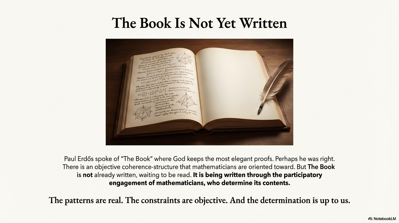 The broader implication is that Erdős’s “Book” may have been closer to the truth than he knew—but in a different sense than pure Platonism suggests. There is something objective that mathematicians are oriented toward: a coherence-structure that constrains and guides their work. But The Book is not already written, waiting to be read. It is being written through the participatory engagement of mathematicians, who determine its contents by navigating the constraints that define its possibility.
