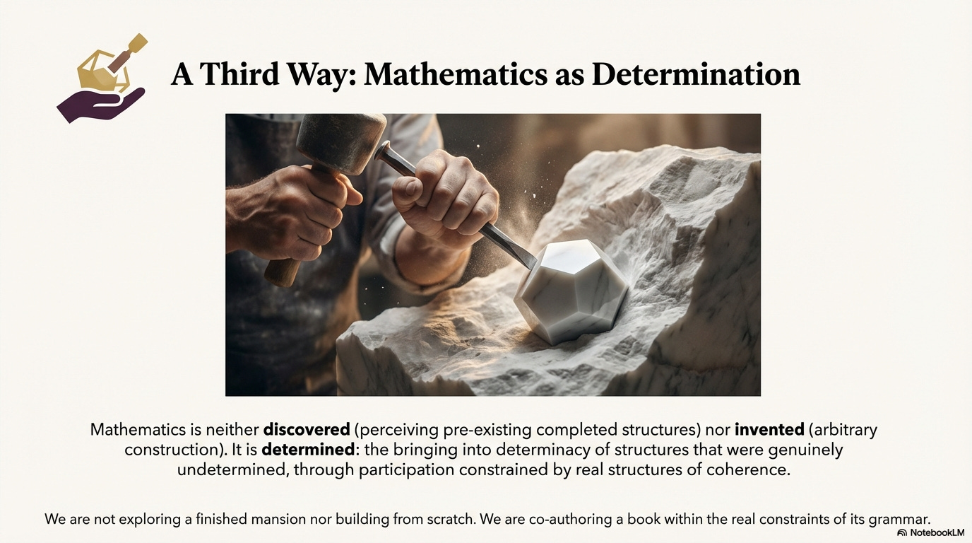 Applied to mathematics, this framework suggests that mathematical activity is neither discovery (perceiving pre-existing completed structures) nor invention (arbitrary construction). It is determination: the bringing into determinacy of structures that were genuinely undetermined, through participation constrained by real coherence-structures.