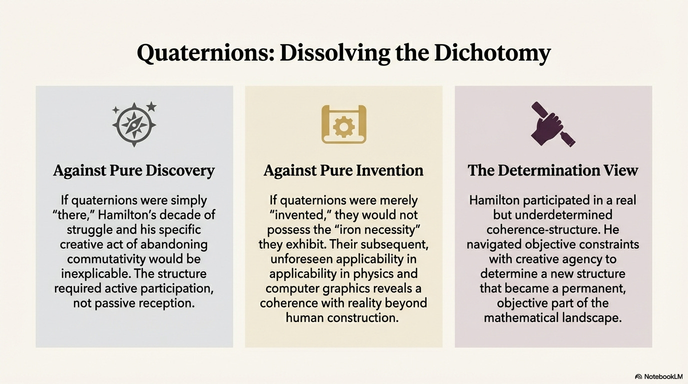 Against Pure Discovery: If quaternions were simply “there” in a Platonic realm, Hamilton’s decade of struggle and his specific creative decision to abandon commutativity would be reduced to a mere “note of an observation,” as Hardy might put it. But the struggle was real, and the creative leap was essential. The structure did not reveal itself passively to a receptive mind; it required active determination through years of constrained participation.
