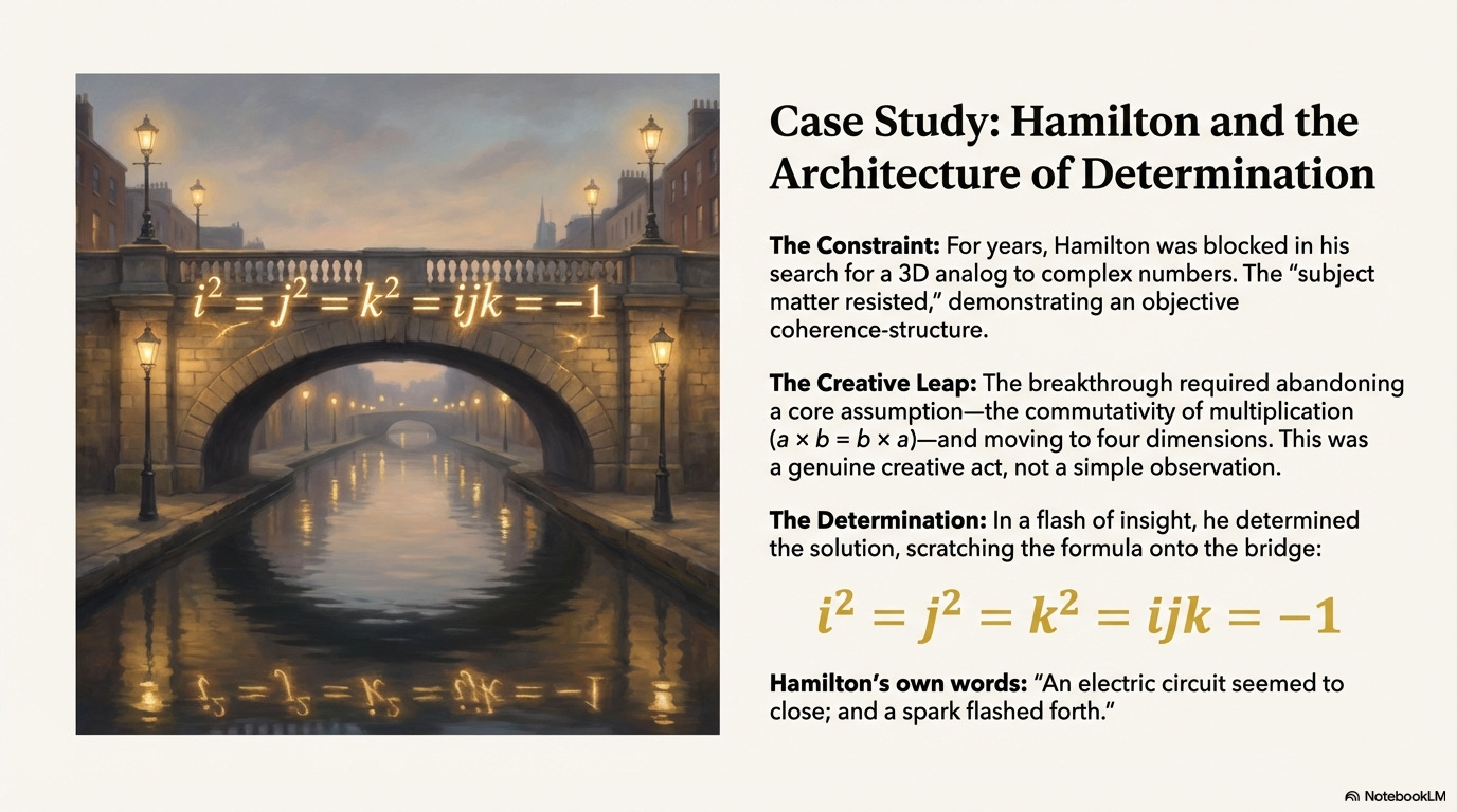 Hamilton, struggling for years to extend the complex numbers, was not merely failing to perceive what was already there. He was participating in a real but underdetermined coherence-structure, and his creative leap—sacrificing commutativity, moving to four dimensions—was a genuine act of determination that brought the quaternions into being. Once determined, they exhibited the objective properties that Platonists rightly emphasize. But their determination required human participation in a way that pure Platonism cannot capture.