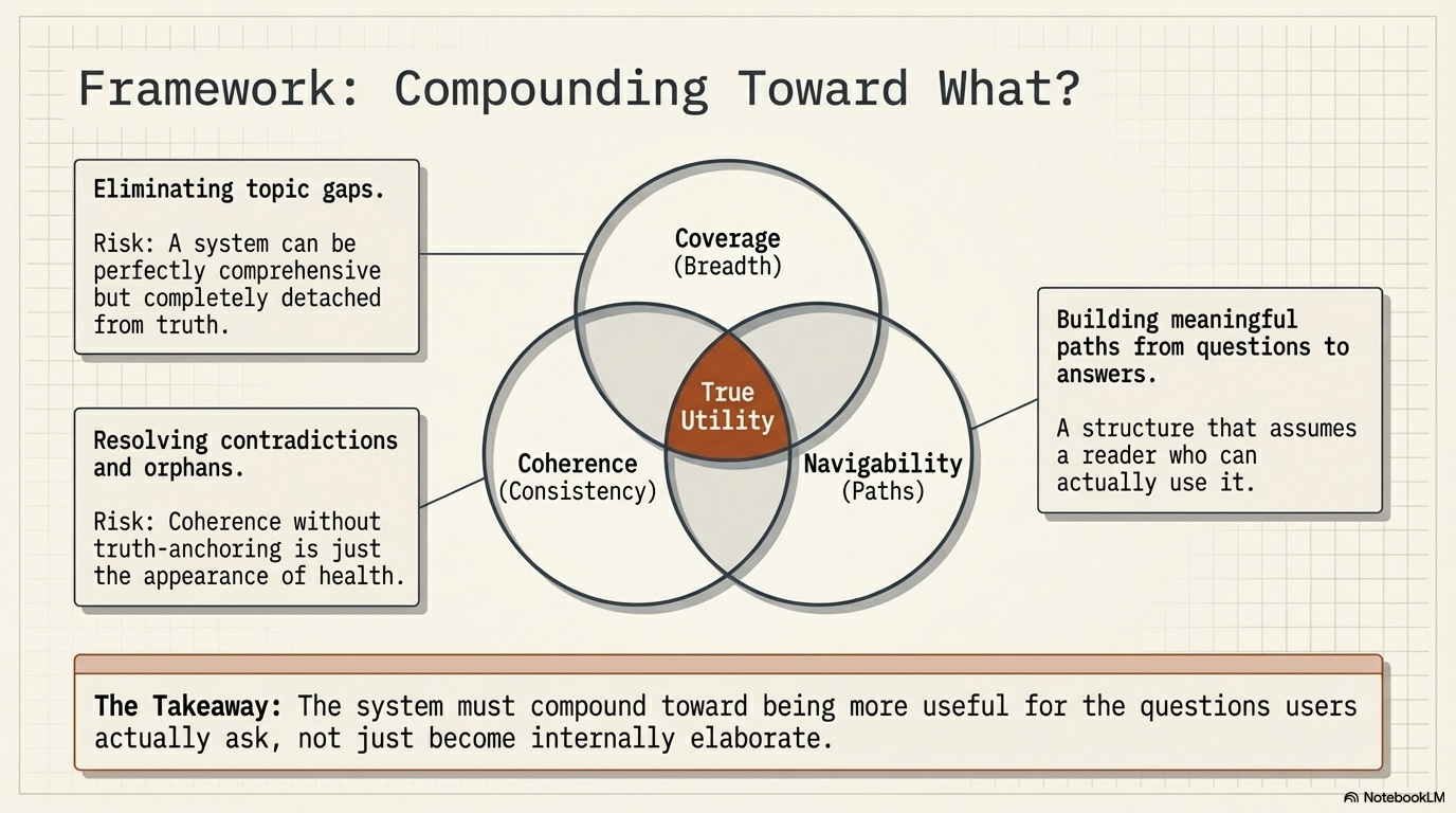 One answer: the wiki compounds toward coverage. A perfectly compounded wiki would have a page for every concept. But coverage alone is insufficient. A wiki can have complete coverage and still be shallow or wrong, measuring breadth over depth.