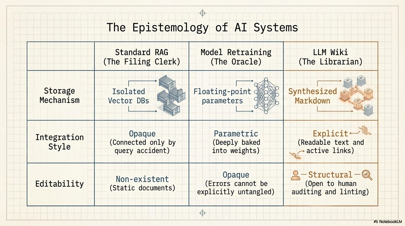 There is, of course, another way to update what an AI knows: you can retrain the underlying model from scratch on the new material. When a model is retrained, it certainly integrates the new documents; its internal weights shift considerably to reflect the new concepts. It is the ultimate Oracle. But this integration is entirely opaque. It is parametric, not explicit. If an error like the SHA-256 fallacy is baked into a model’s weights during training, there is no page to edit, no cross-reference to untangle, no historical card to append a correction to. You cannot “lint” a neural network’s weights. You just have to hope you can fine-tune the error out of it later.