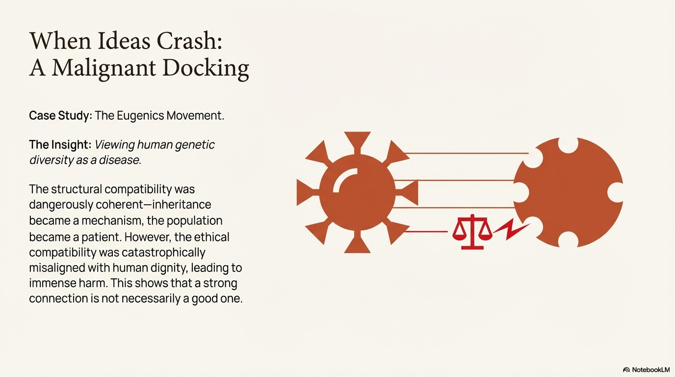 However, not all dockings are benign. The eugenics movement viewed human genetic diversity as disease. The structural compatibility was real—inheritance became mechanism, population became patient—but the ethical compatibility was catastrophically misaligned with human dignity.