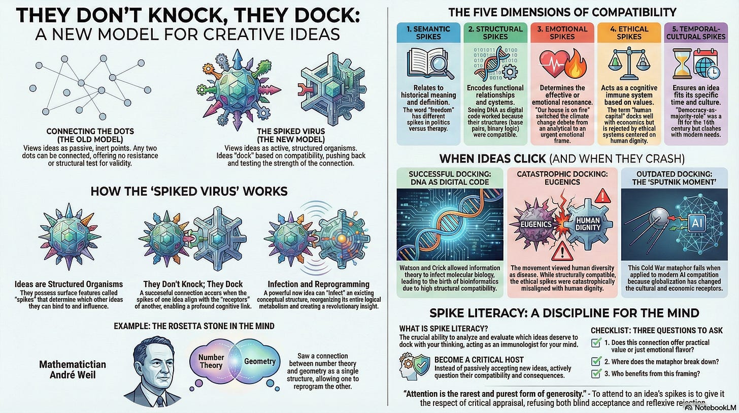 To navigate this ecosystem, we need “spike literacy”—the ability to evaluate which ideas deserve to dock with our thinking. This is mind-making: the practice of deciding which connections to host and which to reject.